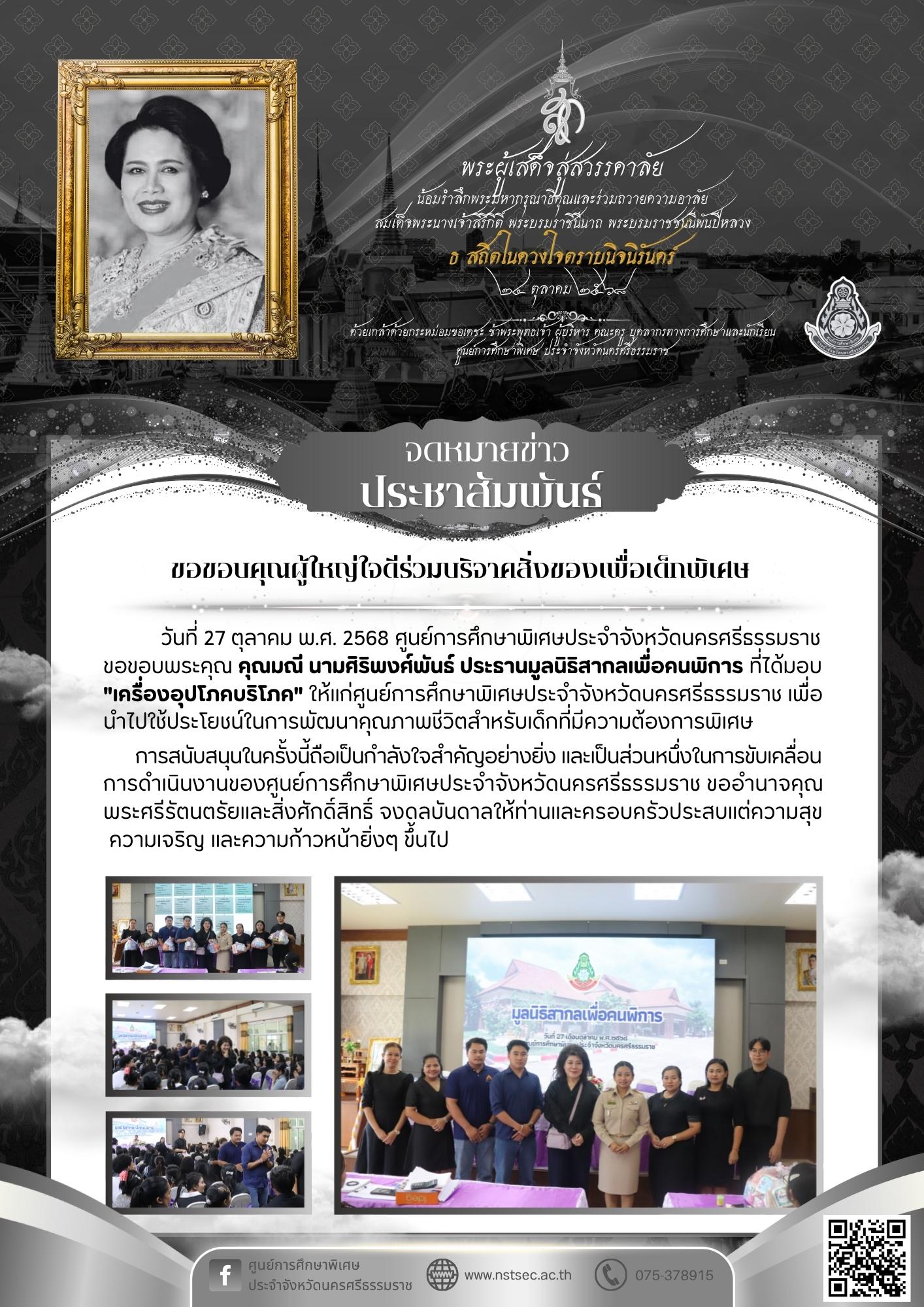 ขอขอบพระคุณ คุณมณี นามศิริพงศ์พันธ์ ประธานมูลนิธิสากลเพื่อคนพิการ ที่ได้มอบ"เครื่องอุปโภคบริโภค" ให้แก่ศูนย์การศึกษาพิเศษประจำจังหวัดนครศรีธรรมราช เพื่อนำไปใช้ประโยชน์ในการพัฒนาคุณภาพชีวิตสำหรับเด็กที่มีความต้องการพิเศษการสนับสนุนในครั้งนี้ถือเป็นกำลังใจสำคัญอย่างยิ่ง และเป็นส่วนหนึ่งในการขับเคลื่อนการดำเนินงานของศูนย์การศึกษาพิเศษประจำจังหวัดนครศรีธรรมราช ขออำนาจคุณพระศรีรัตนตรัยและสิ่งศักดิ์สิทธิ์ จงดลบันดาลให้ท่านและครอบครัวประสบแต่ความสุข