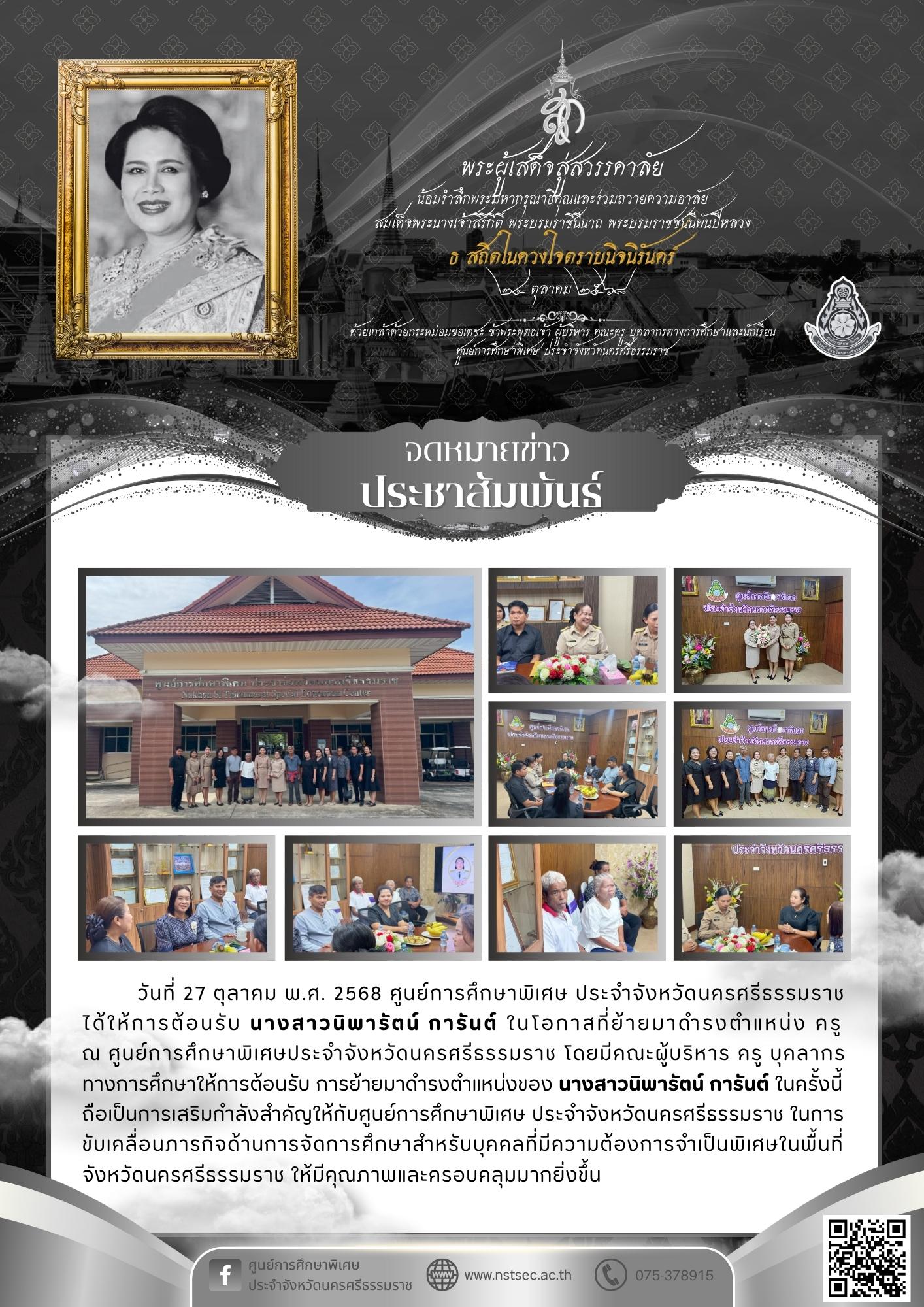 วันที่ 27 ตุลาคม พ.ศ. 2568 ศูนย์การศึกษาพิเศษ ประจำจังหวัดนครศรีธรรมราชได้ให้การต้อนรับ นางสาวนิพารัตน์ การันต์ ในโอกาสที่ย้ายมาดำรงตำแหน่ง ครู ณ ศูนย์การศึกษาพิเศษประจำจังหวัดนครศรีธรรมราช โดยมีคณะผู้บริหาร ครู บุคลากรทางการศึกษาให้การต้อนรับ การย้ายมาดำรงตำแหน่งของ นางสาวนิพารัตน์ การันต์ ในครั้งนี้