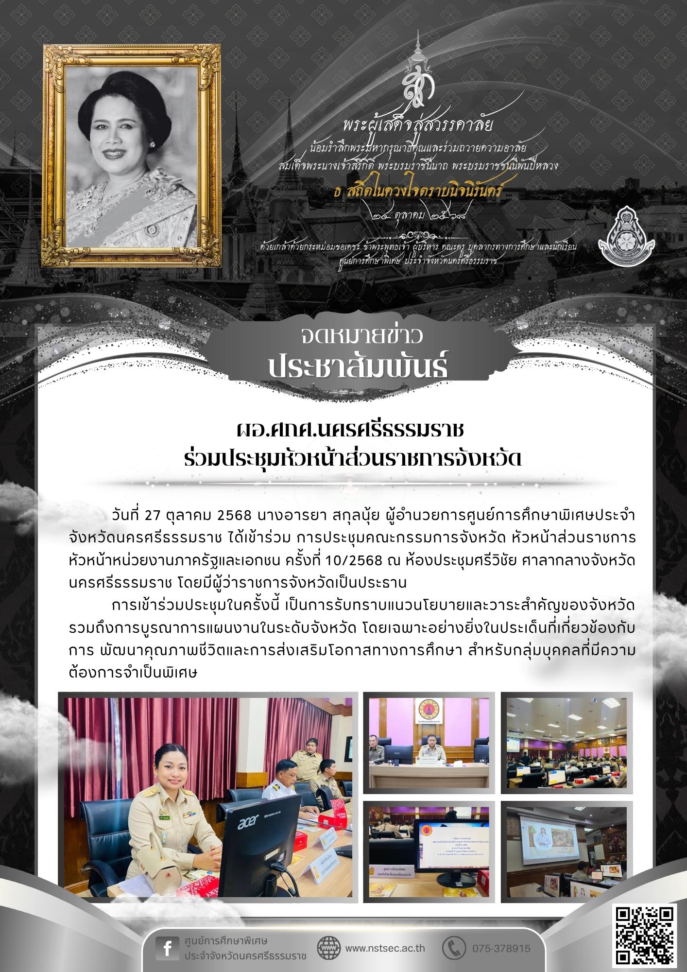 วันที่ 27 ตุลาคม 2568 นางอารยา สกุลนุ้ย ผู้อำนวยการศูนย์การศึกษาพิเศษประจำจังหวัดนครศรีธรรมราช ได้เข้าร่วม การประชุมคณะกรรมการจังหวัด หัวหน้าส่วนราชการหัวหน้าหน่วยงานภาครัฐและเอกชน ครั้งที่ 10/2568 ณ ห้องประชุมศรีวิชัย ศาลากลางจังหวัดนครศรีธรรมราช โดยมีผู้ว่าราชการจังหวัดเป็นประธานการเข้าร่วมประชุมในครั้งนี้ เป็นการรับทราบแนวนโยบายและวาระสำคัญของจังหวัดรวมถึงการบูรณาการแผนงานในระดับจังหวัด โดยเฉพาะอย่างยิ่งในประเด็นที่เกี่ยวข้องกับการ พัฒนาคุณภาพชีวิตและการส่งเสริมโอกาสทางการศึกษา สำหรับกลุ่มบุคคลที่มีความต้องการจำเป็นพิเศษ