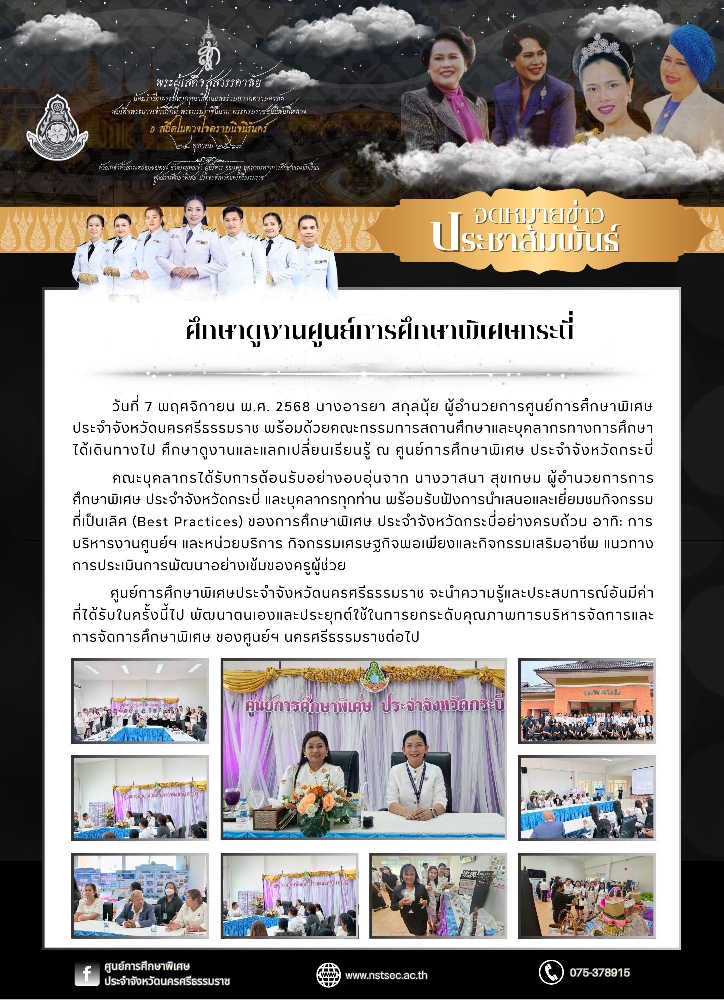 วันที่ 7 พฤศจิกายน พ.ศ. 2568 นางอารยา สกุลนุ้ย ผู้อำนวยการศูนย์การศึกษาพิเศษประจำจังหวัดนครศรีธรรมราช พร้อมด้วยคณะกรรมการสถานศึกษาและบุคลากรทางการศึกษาได้เดินทางไป ศึกษาดูงานและแลกเปลี่ยนเรียนรู้ ณ ศูนย์การศึกษาพิเศษ ประจำจังหวัดกระบี่