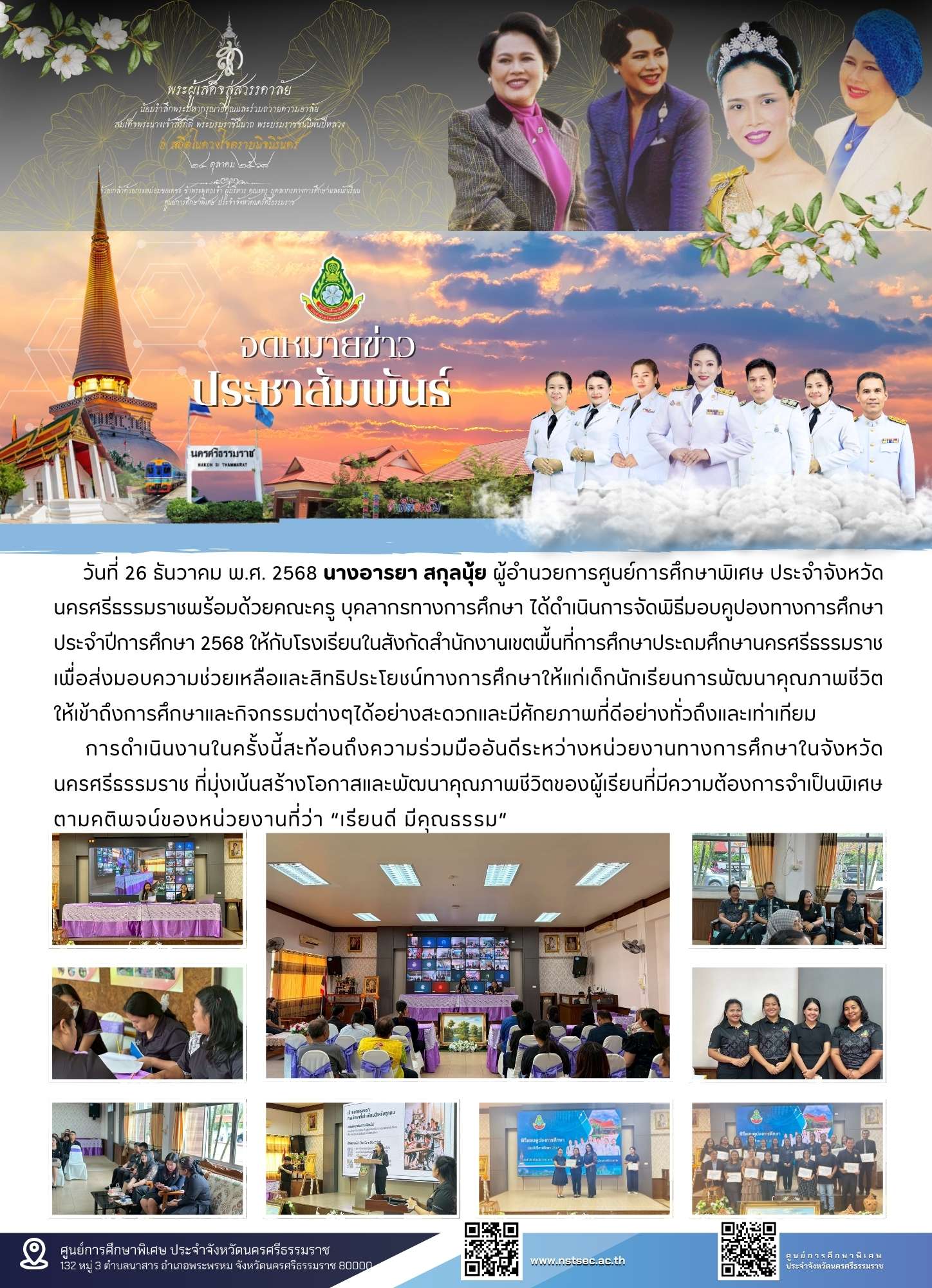 วันที่ 26 ธันวาคม พ.ศ. 2568 นางอารยา สกุลนุ้ย ผู้อำนวยการศูนย์การศึกษาพิเศษ ประจำจังหวัดนครศรีธรรมราชพร้อมด้วยคณะครู บุคลากรทางการศึกษา ได้ดำเนินการจัดพิธีมอบคูปองทางการศึกษาประจำปีการศึกษา 2568 ให้กับโรงเรียนในสังกัดสำนักงานเขตพื้นที่การศึกษาประถมศึกษานครศรีธรรมราชเพื่อส่งมอบความช่วยเหลือและสิทธิประโยชน์ทางการศึกษาให้แก่เด็กนักเรียนการพัฒนาคุณภาพชีวิตให้เข้าถึงการศึกษาและกิจกรรมต่างๆได้อย่างสะดวกและมีศักยภาพที่ดีอย่างทั่วถึงและเท่าเทียมการดำเนินงานในครั้งนี้สะท้อนถึงความร่วมมืออันดีระหว่างหน่วยงานทางการศึกษาในจังหวัดนครศรีธรรมราช ที่มุ่งเน้นสร้างโอกาสและพัฒนาคุณภาพชีวิตของผู้เรียนที่มีความต้องการจำเป็นพิเศษตามคติพจน์ของหน่วยงานที่ว่า “เรียนดี มีคุณธรรม”