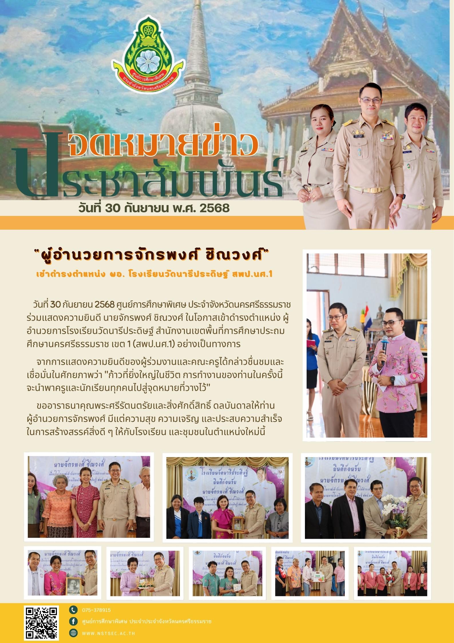 วันที่ 30 กันยายน 2568 ศูนย์การศึกษาพิเศษ ประจำจังหวัดนครศรีธรรมราช ร่วมแสดงความยินดี นายจักรพงศ์ ชิณวงศ์ ในโอกาสเข้าดำรงตำแหน่ง ผู้อำนวยการโรงเรียนวัดนารีประดิษฐ์ สำนักงานเขตพื้นที่การศึกษาประถมศึกษานครศรีธรรมราช เขต 1 (สพป.นศ.1) อย่างเป็นทางการจากการแสดงความยินดีของผู้ร่วมงานและคณะครูได้กล่าวชื่นชมและเชื่อมั่นในศักยภาพว่า "ก้าวที่ยิ่งใหญ่ในชีวิต การทำงานของท่านในครั้งนี้ จะนำพาครูและนักเรียนทุกคนไปสู่จุดหมายที่วางไว้"