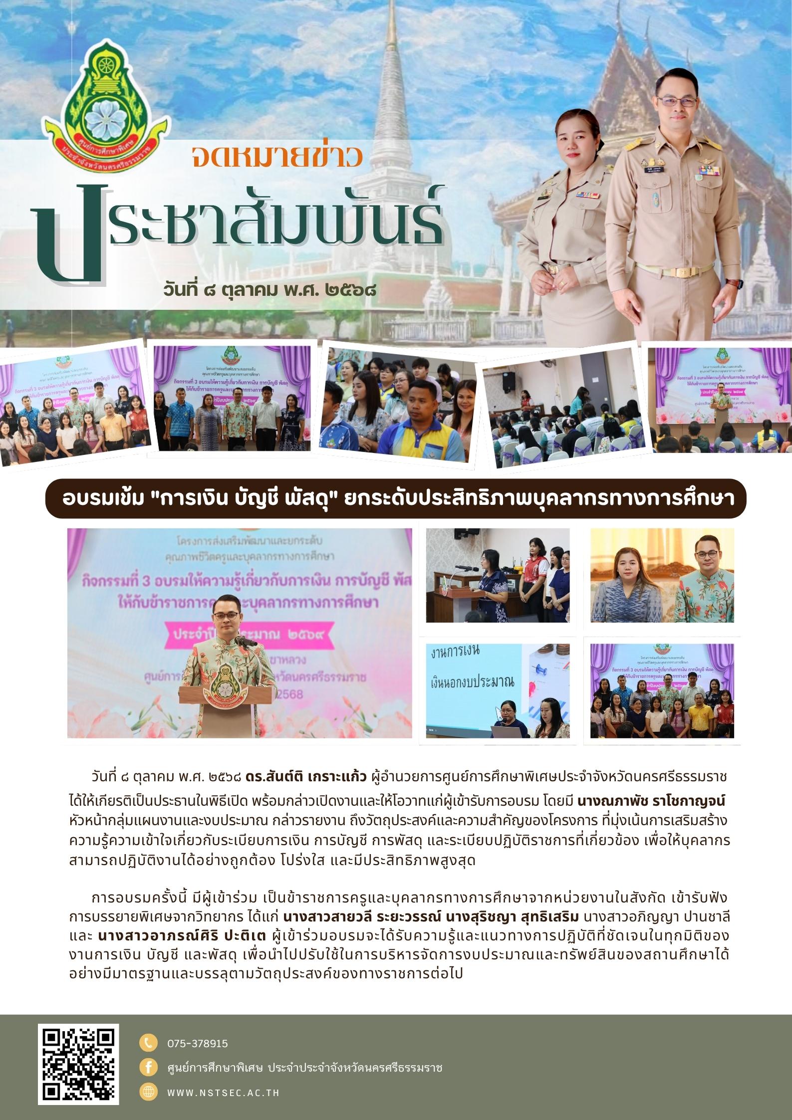 วันที่ ๘ ตุลาคม พ.ศ. ๒๕๖๘ ดร.สันต์ติ เกราะแก้ว ผู้อำนวยการศูนย์การศึกษาพิเศษประจำจังหวัดนครศรีธรรมราช ได้ให้เกียรติเป็นประธานในพิธีเปิด พร้อมกล่าวเปิดงานและให้โอวาทแก่ผู้เข้ารับการอบรม โดยมี นางณภาพัช ราโชกาญจน์ หัวหน้ากลุ่มแผนงานและงบประมาณ กล่าวรายงาน ถึงวัตถุประสงค์และความสำคัญของโครงการ ที่มุ่งเน้นการเสริมสร้างความรู้ความเข้าใจเกี่ยวกับระเบียบการเงิน การบัญชี การพัสดุ และระเบียบปฏิบัติราชการที่เกี่ยวข้อง เพื่อให้บุคลากร สามารถปฏิบัติงานได้อย่างถูกต้อง โปร่งใส และมีประสิทธิภาพสูงสุด
