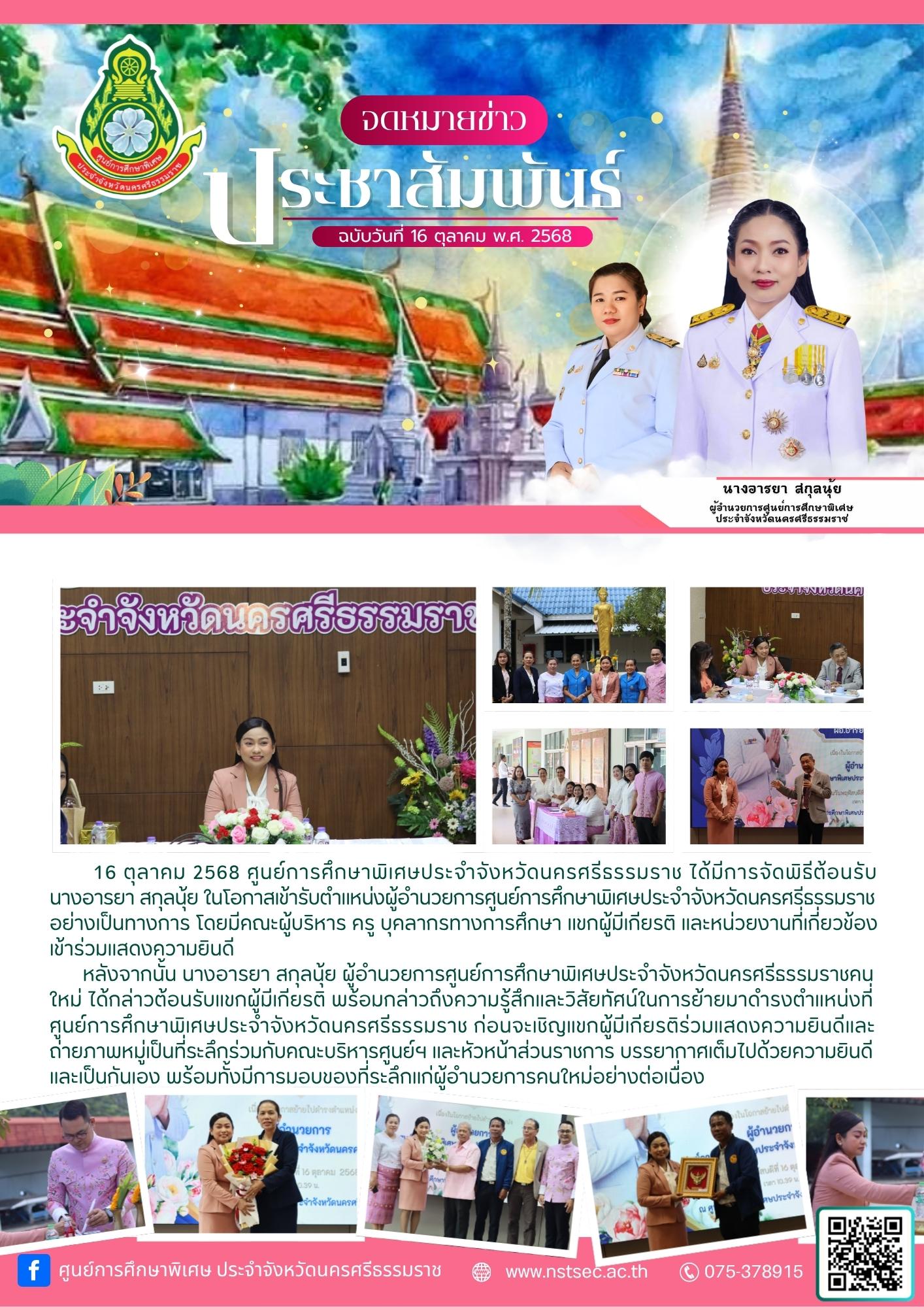 16 ตุลาคม 2568 ศูนย์การศึกษาพิเศษประจำจังหวัดนครศรีธรรมราช ได้มีการจัดพิธีต้อนรับนางอารยา สกุลนุ้ย ในโอกาสเข้ารับตำแหน่งผู้อำนวยการศูนย์การศึกษาพิเศษประจำจังหวัดนครศรีธรรมราชอย่างเป็นทางการ โดยมีคณะผู้บริหาร ครู บุคลากรทางการศึกษา แขกผู้มีเกียรติ และหน่วยงานที่เกี่ยวข้องเข้าร่วมแสดงความยินดีหลังจากนั้น นางอารยา สกุลนุ้ย ผู้อำนวยการศูนย์การศึกษาพิเศษประจำจังหวัดนครศรีธรรมราชคนใหม่ ได้กล่าวต้อนรับแขกผู้มีเกียรติ พร้อมกล่าวถึงความรู้สึกและวิสัยทัศน์ในการย้ายมาดำรงตำแหน่งที่